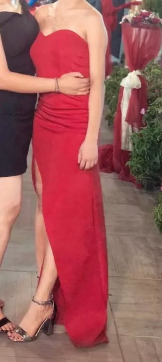 Kırmızı straplez Uzun yırtmaçlı Drapeli Elbise