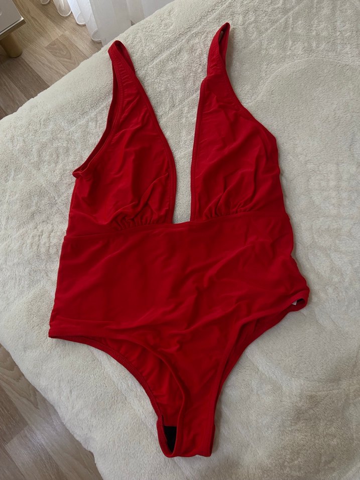 Kırmızı, derin V yakalı ve askılı bu kadın mayo, cesur ve zahmetsiz şıklık sunar. Midi boyu ve desensiz tasarımı plaj ve spor şıklığı için uygundur.