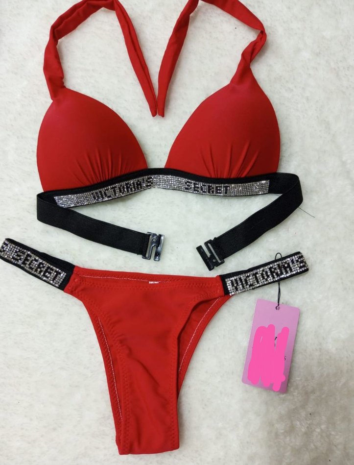 Kırmızı, strappy askılı ve elastik bantlı baskılı detaylara sahip mini bikini set. Plajda streetwear tarzı için uygun.