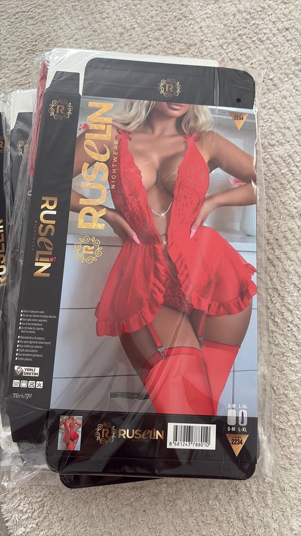 Kırmızı, strappy kollu, baskılı ve parlak kumaştan mini gecelik. Avant-garde gotik tarzda, Ruselin markası. Uyumlu çoraplar dahil.