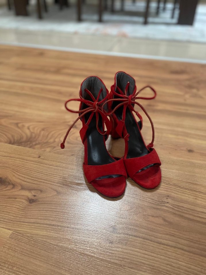 Kırmızı süet malzemeden, ince topuklu ve bağcıklı tasarıma sahip kadın ayakkabısı. Cesur ve minimalist tarz için uygundur.