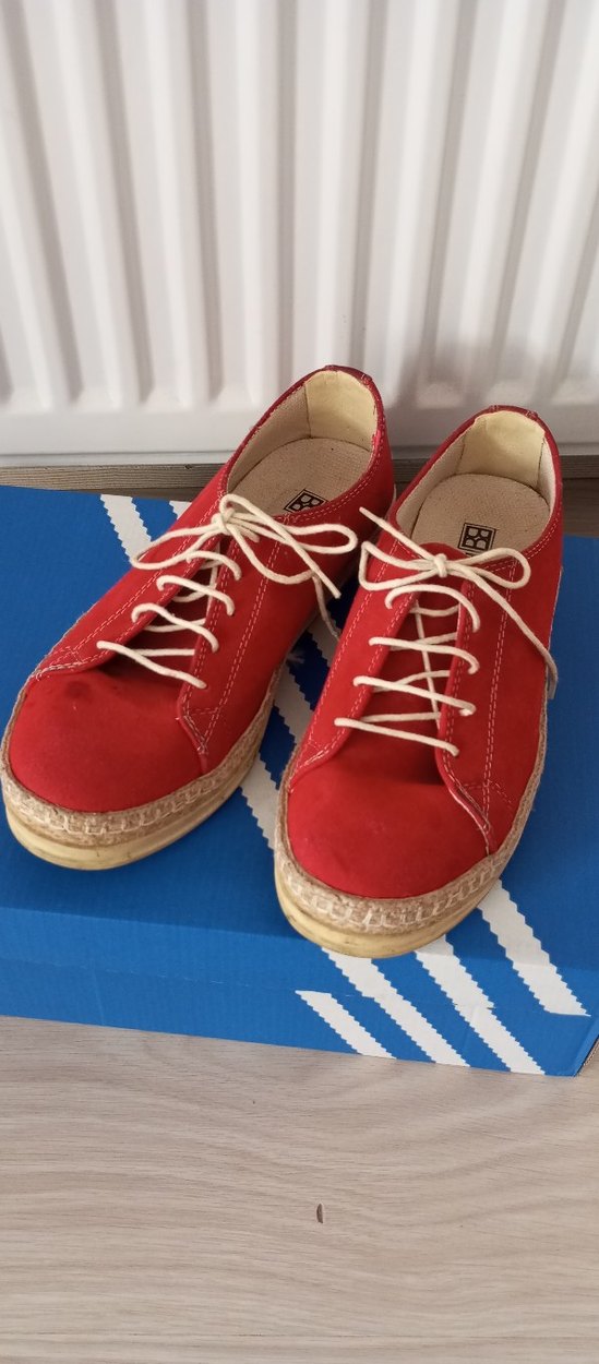 Az kullanıımış,Kırmızı süet bayan espadril, beyaz bağcıklı, klasik tasarımlı ve günlük rahat kullanım için konforlu dokuma tabanlı.