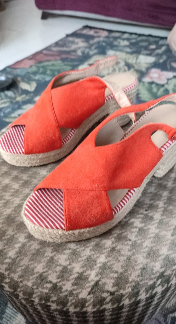 Kırmızı süet dolgu topuklu espadriller, renkli çizgili desenli iç taban, günlük kullanım için bohem tarzda.