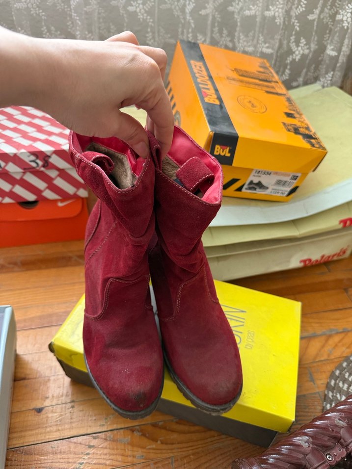 Kırmızı süet malzemeden yapılmış, dolgu topuklu ve tokalı kadın botu. Bohem ve sokak stiline uygun, desen içermeyen günlük kullanıma uygun.