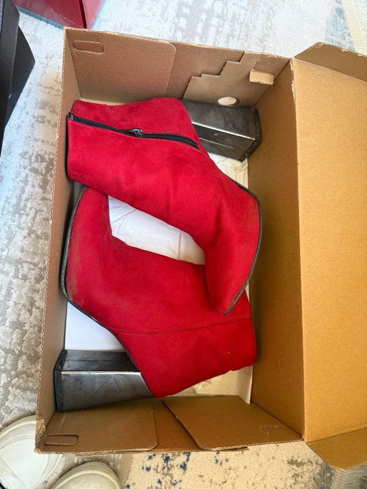 Kırmızı süet kadın bot, dolgu topuklu ve fermuarlı, desen içermeyen şık tasarımıyla romantik akşamlar için uygun. ❤️