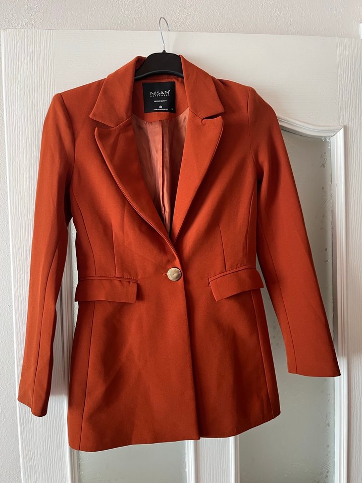 Kırmızı süet kumaştan, düğmeli, normal boy midi uzunlukta, keskin yakalı, uzun kollu kadın blazer ceket. İş ve günlük şıklık için uygundur.