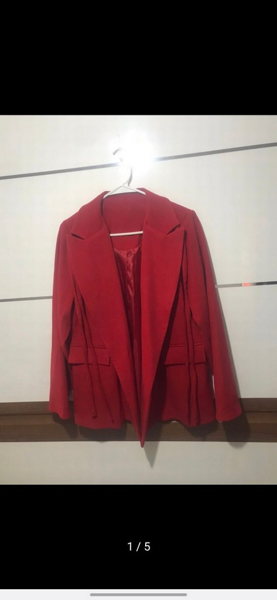Kırmızı süet kumaştan yapılmış, düğmeli ve kesik yaka detaylı kadın blazer ceket. Normal boyda, uzun kollu ve sade tasarımıyla ofis için uygundur. Standart bedendir. Byelhafashion'dan alınmıştır. Hiç kullanılmamıştır. Etiketli üründür.