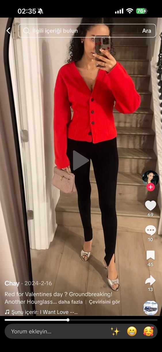 Kırmızı süet kumaştan yapılmış, düğmeli ve kesimli yakalı, uzun kollu, midi uzunlukta ofis hırka . Trendy casual stil için uygundur.