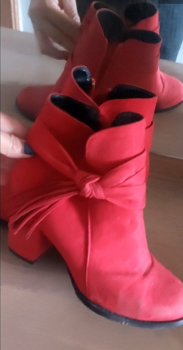Kırmızı süet malzemeden, blok topuklu ve büyük fiyonk detaylı kadın botları. Canlı renkli, desensiz ve sokak modasına uygun.