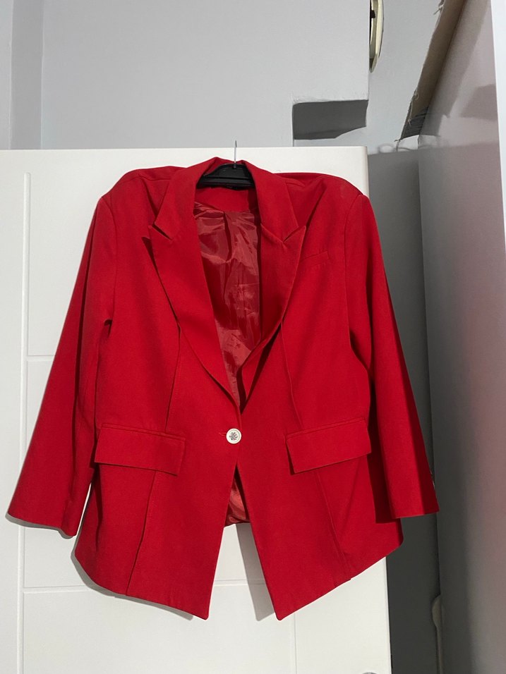 Kırmızı süet blazer, düğmeli ve kesik yakalıdır. Uzun kollu, regular fit ve ofis stiline uygundur. ✨