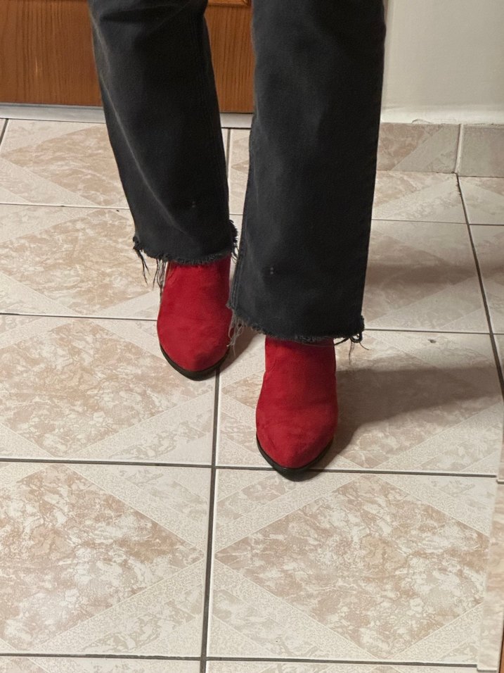 Kare topuklu, kırmızı süet kadın botları, günlük kullanıma uygun rahat ve şık bir model.