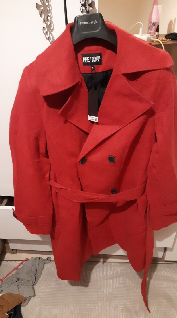 Kırmızı süet kumaştan yapılmış, bele oturan, kemerli midi uzunlukta trençkot. Uzun kollu, desen içermeyen, parlak ve sokak stiline uygun rahat bir modeldir. Boy 90 cm