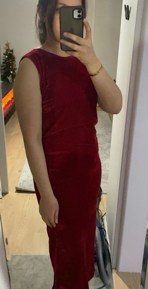 kırmızırenkli, süet kumaştan yapılmış, v yaka ve kolsuz midi elbise. Drapeli detaylarla sade ve cesur bir stil sunar. Romantik akşamlar için uygun.