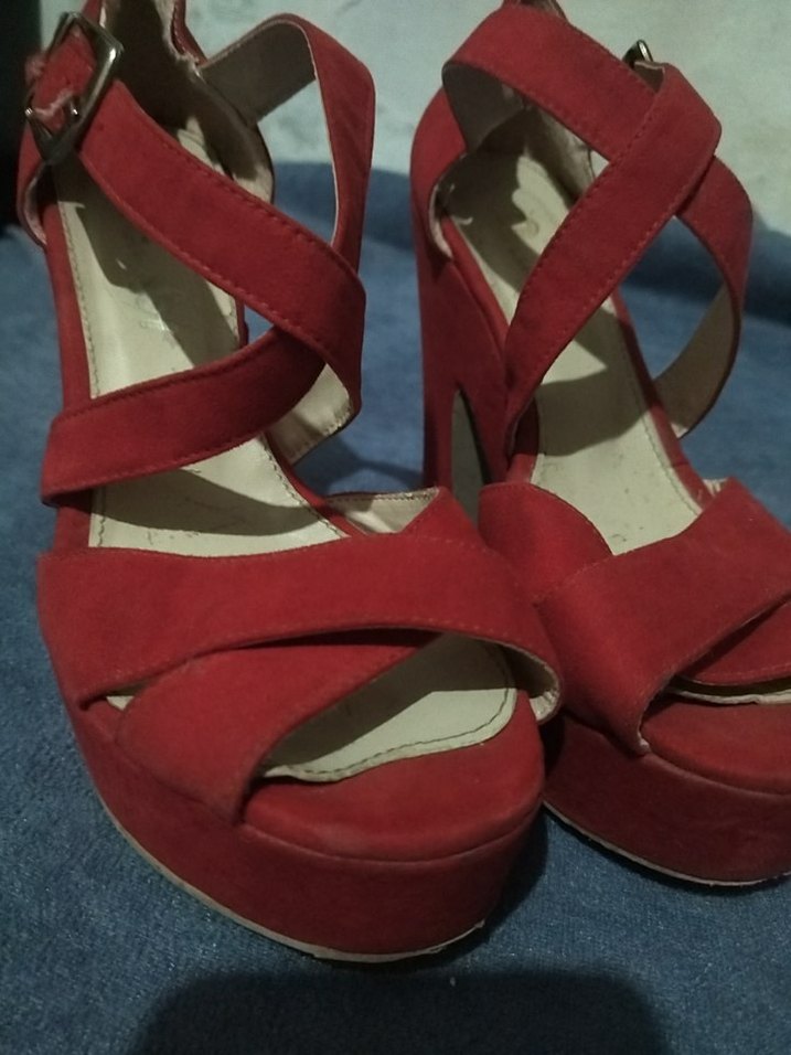 Kırmızı süet malzemeden platform topuklu, tokalı bantlara sahip çağdaş ve minimalist tarza uygun ayakkabı. Romantik akşamlar için ideal. ✨