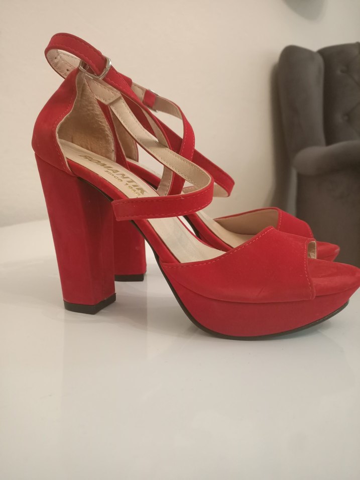 Kırmızı süet platform topuklu, tokalı kayışlı ve çağdaş tasarımlı kadın ayakkabısı. Romantik akşamlar için uygun.