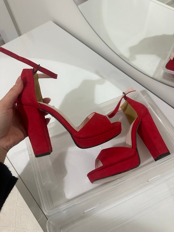 Bu cesur kırmızı süet platform topuklu ayakkabılar, tokalı kayış ve çağdaş minimalist tasarıma sahiptir, romantik akşam buluşmaları için idealdir.