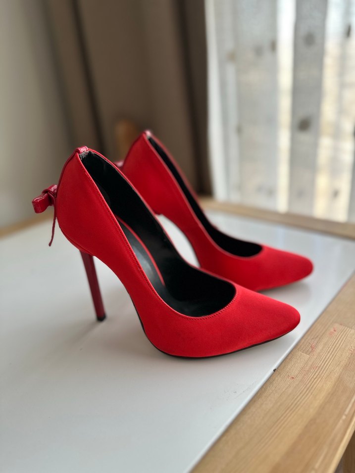 Kırmızı süet malzemeden yapılmış, arkada fiyonk detaylı, sivri burunlu ve yüksek topuklu kadın stiletto. Romantik akşamlar için uygun.