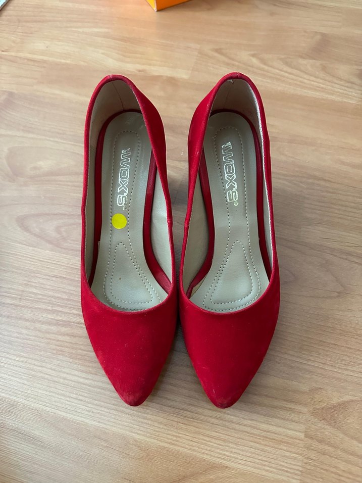 Kırmızı süet malzemeden yapılmış, sivri burunlu ve yüksek topuklu stiletto. Minimalist, cesur stil ile ofis kullanımına uygun. Marka: WOXS.