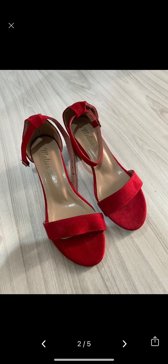 Parlak kırmızı süet, tokalı bantlı stiletto topuklu kadın ayakkabısı. Modern klasik tarzda, romantik akşamlar için uygun.