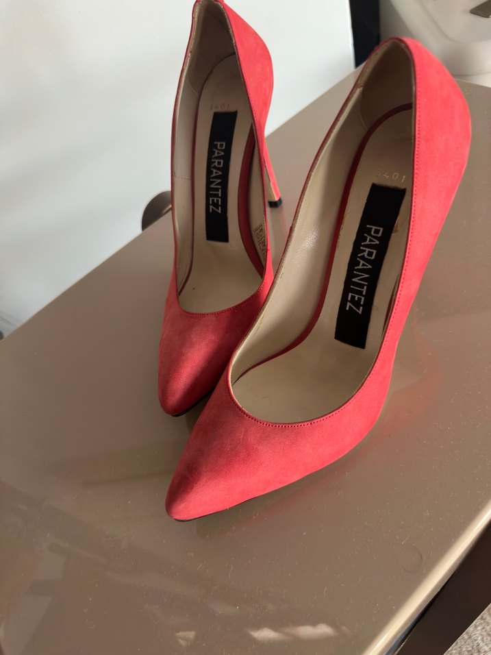 Parantez markalı, kırmızı süet stiletto topuklu, minimal baskılı tasarıma sahip kadın ayakkabı. Romantik gece için şık ve iddialı bir tercih. ❤️