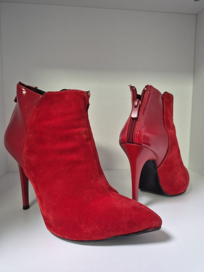 Kırmızı süet malzemeden yapılmış, stiletto topuklu ve fermuarlı kadın botu. Romantik akşamlar için ideal bir seçim. ❤️
