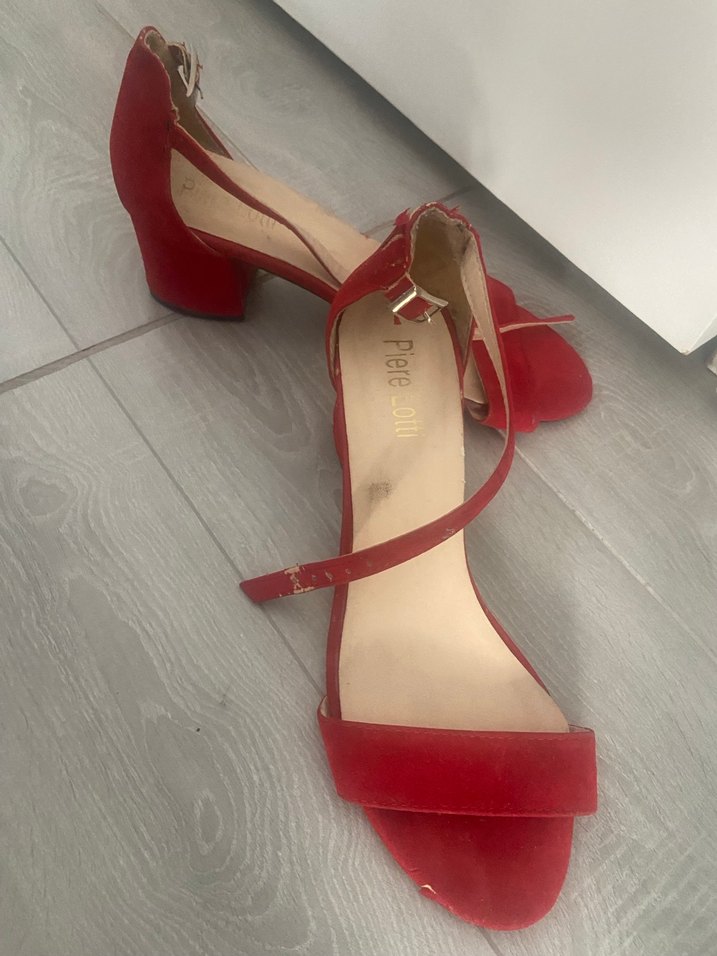 Kırmızı süet kadın ayakkabısı, parlak blok topuk ve tokalı bant ile romantik gecelere uygun cesur, çağdaş bir tarz sunar. ❤️