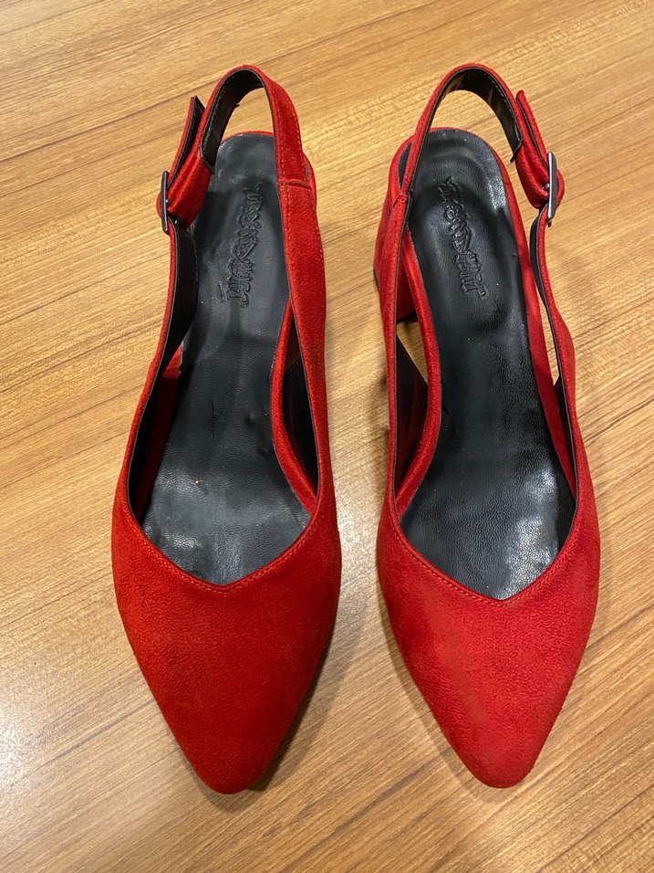 * Kırmızı süet malzemeden, tokalı ve blok topuklu kadın topuklu ayakkabı. Cesur ve çağdaş tarzı yansıtır, romantik akşamlar için uygun. ❤️ * Markası: Trendyhit * Önü kapalı, arkası açık * Topuk yüksekliği: 7 cm * Çok az ve çok temiz kullanılmıştır. En fazla 5 defa giyilmiştir. * Hiçbir hasarı yoktur. Tokası, topuğu, kemeri, altı, üstü, her yeri sağlamdır ve tertemizdir.