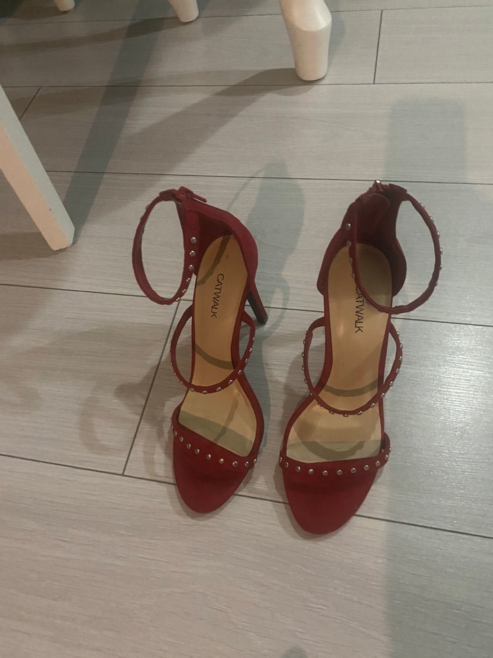 Kırmızı süet malzemeden, tokalı bantları ve parlak desen detaylarıyla stiletto topuklu ayakkabılar. Cesur ve minimal tasarım, romantik akşamlar için uygun. Bir defa kullanıldı tertemiz.