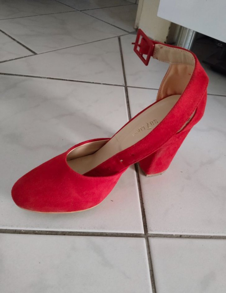 Kırmızı süet malzemeden, tokalı ve blok topuklu kadın ayakkabısı. Minimalist ve çağdaş tarzıyla günlük kullanıma uygun, cesur ve renkli tasarım.