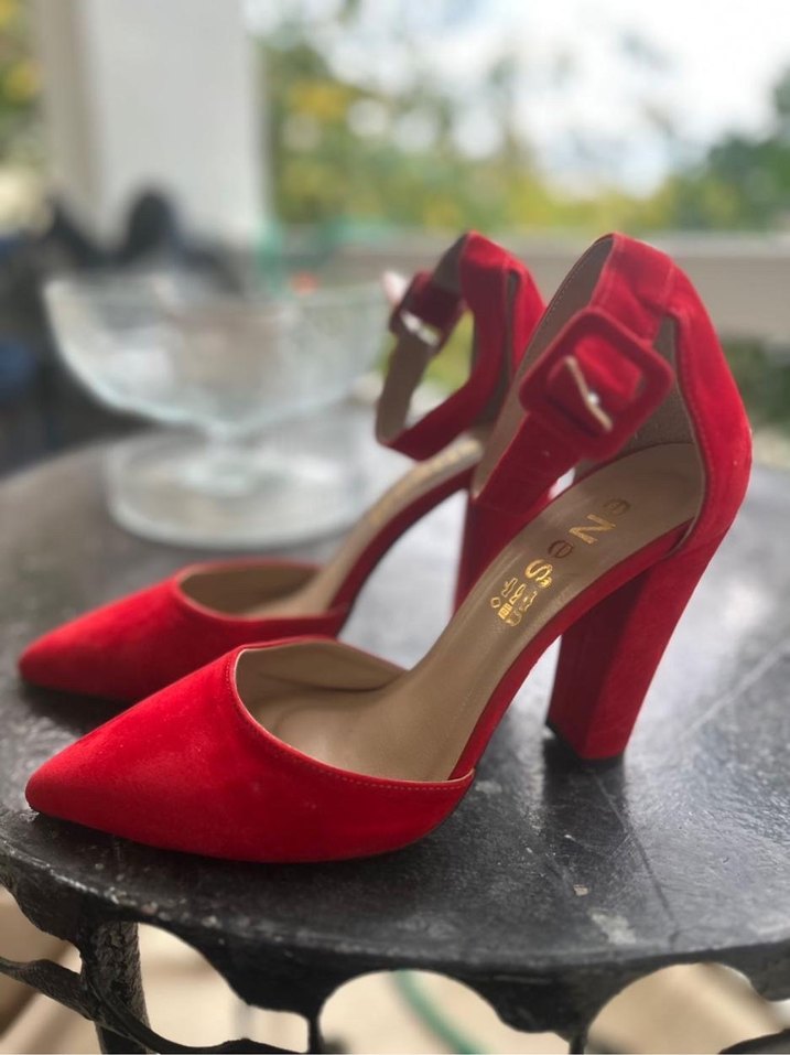 Kırmızı süet tokalı yüksek topuklu kadın ayakkabısı, önününde ufak tefek lekeler var 4 fotoğrafta belirttim.