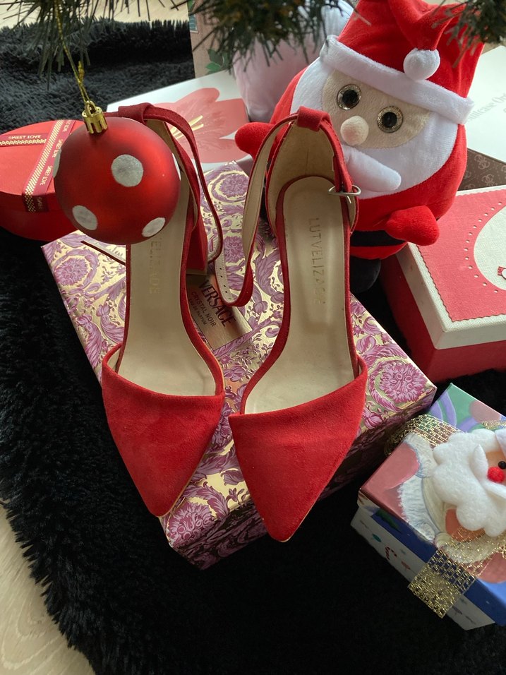 Kırmızı süetten, tokalı bantlı, renkli desenli yüksek topuklu stiletto, romantik akşamlar için uygun.