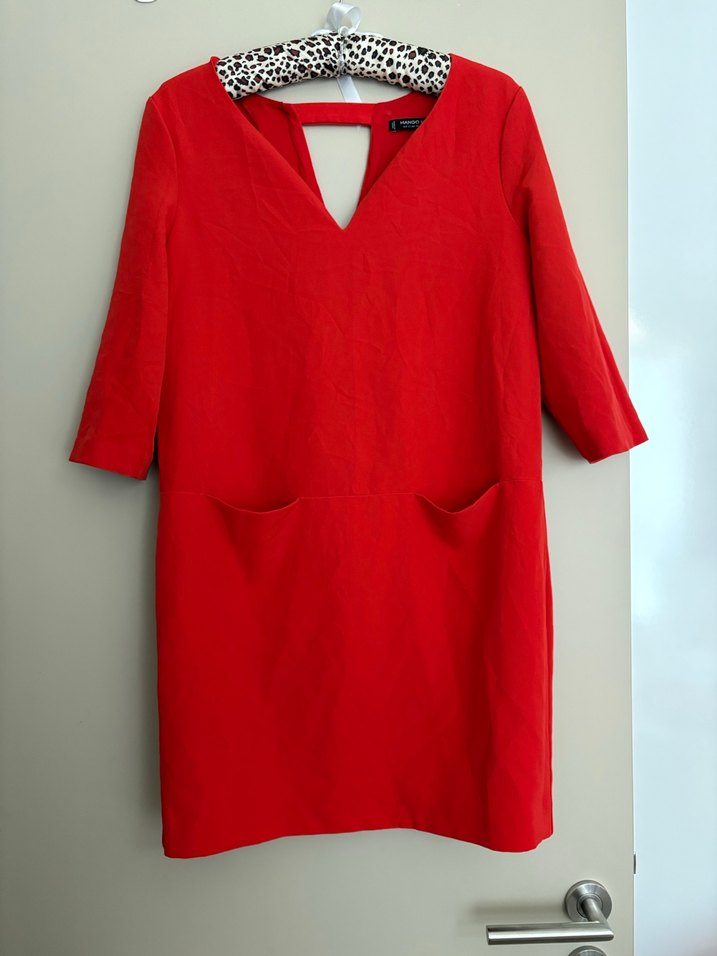 Kırmızı v yaka sırt detaylı cepli kısa kollu astarlı. Salaş kesimi ve drapeli detayı ile midi boyda, parlak görünümü romantik akşamlar için uygun. ❤️ #mango #mangoelbise #kırmızıelbise