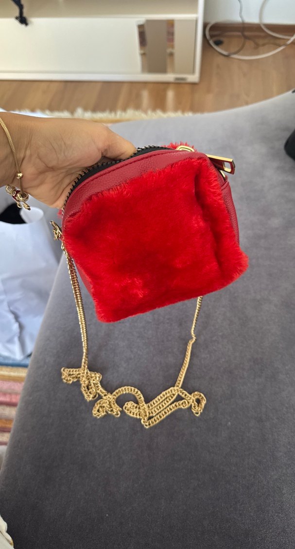 Kırmızı süet dokulu, kürklü ön detaylı ve altın zincir askılı kadın çantası. Cesur sokak stili ve rahat bir görünüm sunar.