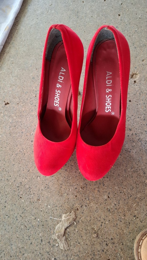 Kırmızı süet yüksek topuklu stiletto, elastik detaylı, cesur ve minimalist sokak tarzı için uygun. Marka: ALDI & SHOES.