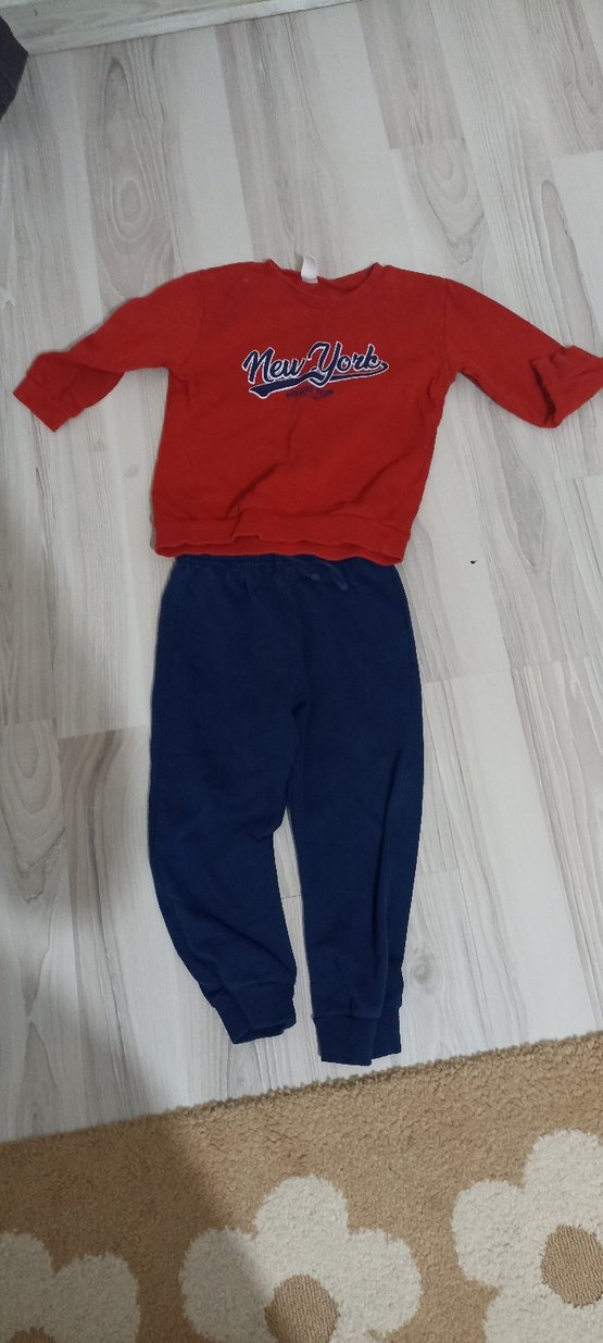 Kırmızı uzun kollu üstünde 'New York' yazısı bulunan, lacivert rahat pantolonla tamamlanan bebek takımı. Yumuşak ve sıcak kumaştan yapılmıştır.