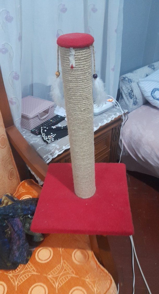Kırmızı tabanlı, doğal ip sarılı uzun kedi tırmalama tahtası, tüy oyuncaklarla eğlence sağlar.