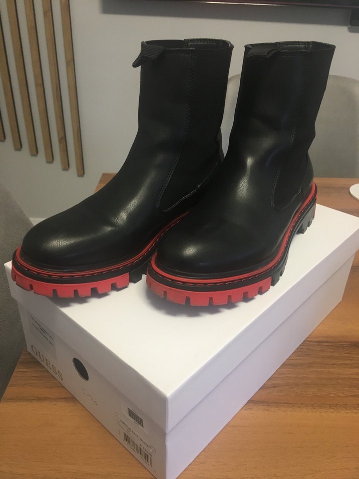 Kırmızı tabanlı, tokalı platform siyah kauçuk kadın botları. Sokak stili ve gotik tarz için uygun, günlük kullanıma uygun.