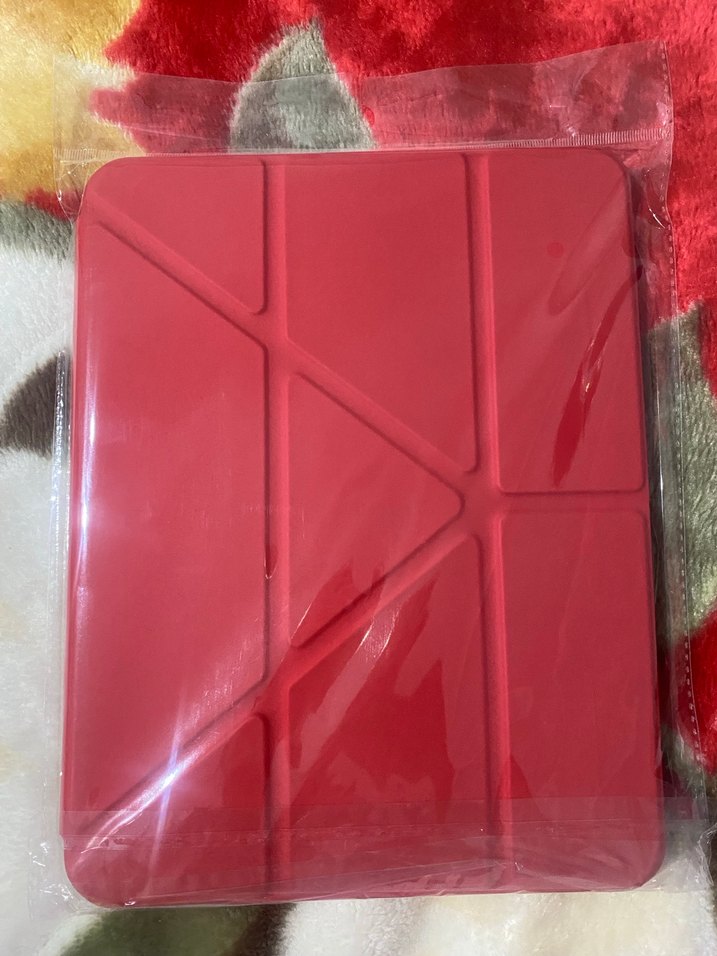 Kırmızı renkte, geometrik desenli tablet kılıfı, cihazınızı korur ve şık görünür. Çeşitli tablet modellerine uygundur.