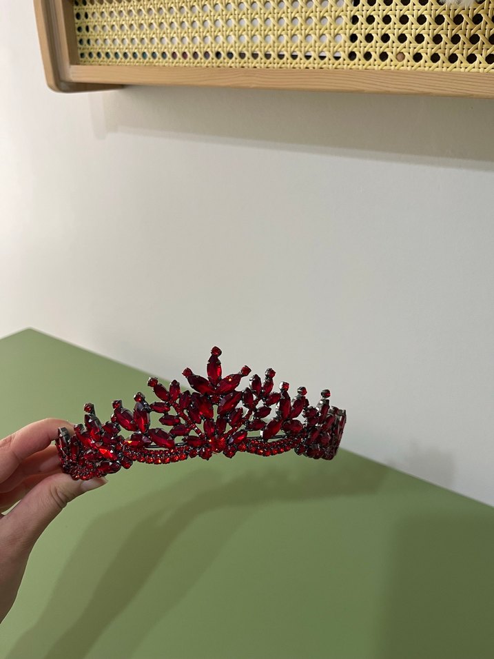 Koyu kırmızı parlak taşlarla süslenmiş saç aksesuarı, gotik tarzda ve klasik zarafet sunar. Parlak ve gösterişli tasarım.kına gecemde 2saatliğine kullandım