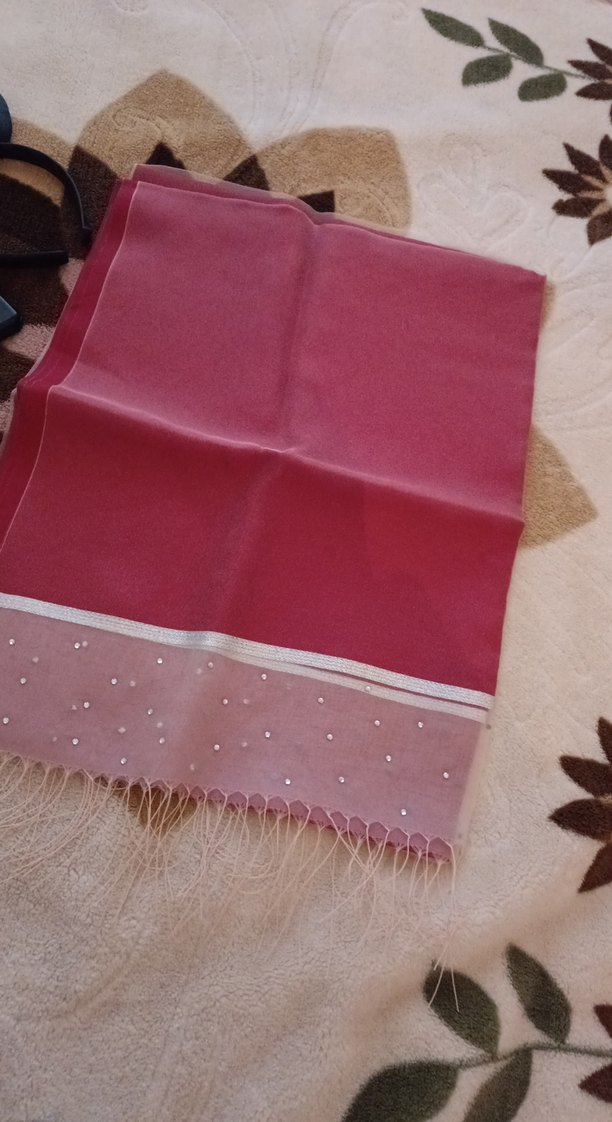 Kırmızı renkli kadın şalı, parlak sentetik kumaştan yapılmış, taş detayları ve ince püskülleriyle zarif bir görünüm sunar. sim şeritlidir. hiç kullanılmadı.