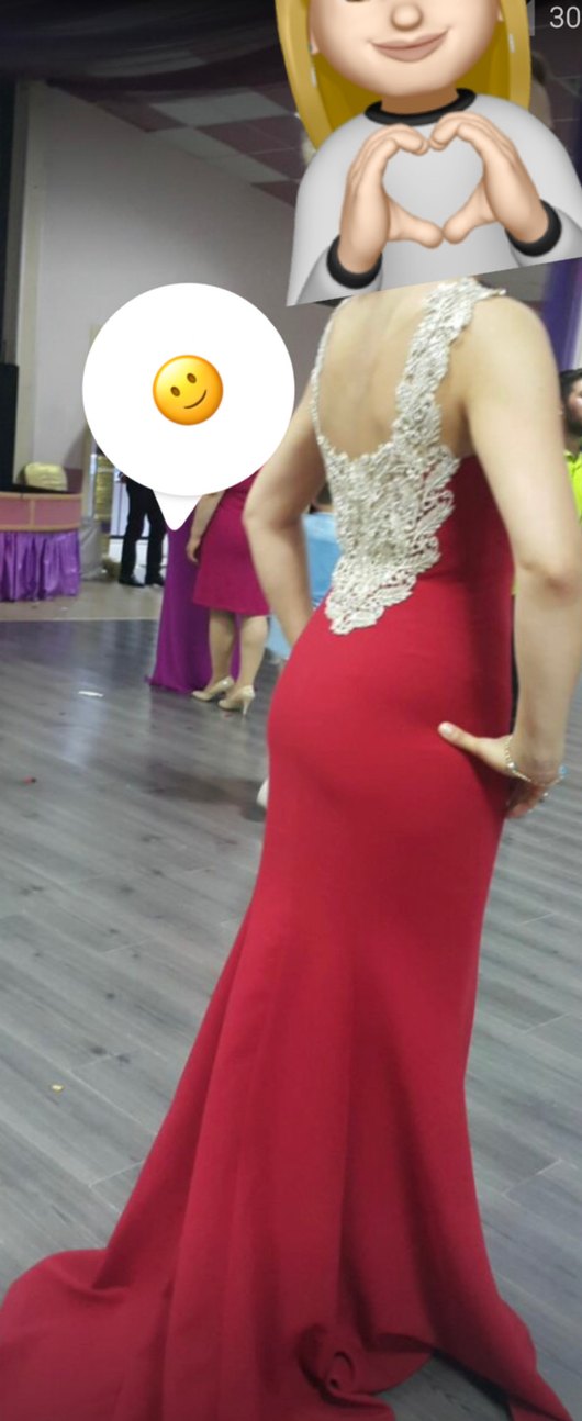 V yaka ve kolsuz, kırmızı renkli, beyaz taş işlemeli detaylı sırtı açık yine taş işlemeli hafif kuyruklu dar kesim elbisedir. Sadece sağ ön tarafta çok hafif tül kısmında sökük vardır.Bir kere giyilmiştir. Ömür Özer markalıdır.