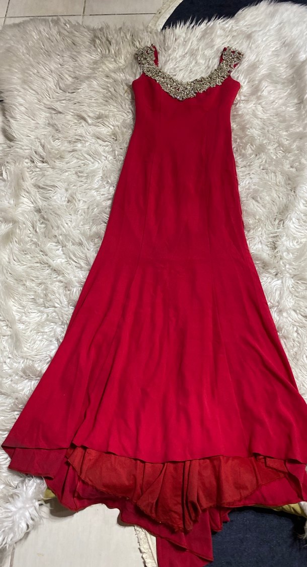 Kırmızı, işlemeli, uzun ve drapeli abiye elbise, tekne yakalı ve kolsuz, klasik şıklık ve bohem tarzı bir arada sunar. ✨marka temsili boy:160 göğüs:80 bel:70 cm