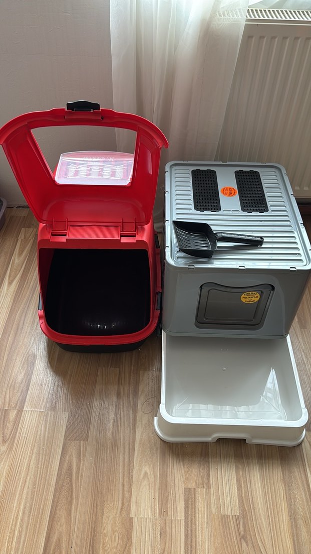 Üstten açılan kırmızı taşıma kabı ve gri kedi tuvaleti, temizliği kolaylaştıran kürek ve çıkarılabilir tepsi içerir.