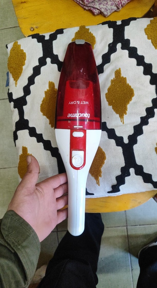 Kırmızı ve beyaz renkte, ıslak ve kuru kullanım özellikli taşınabilir el süpürgesi. Kompakt ve hızlı temizlik için uygundur.