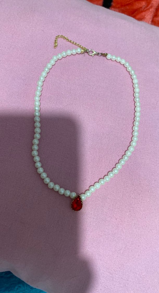 Bohem tarzda, beyaz boncuklardan oluşan midi kolye, kırmızı işleme taş detaylıdır. Romantik akşamlar için uygundur.