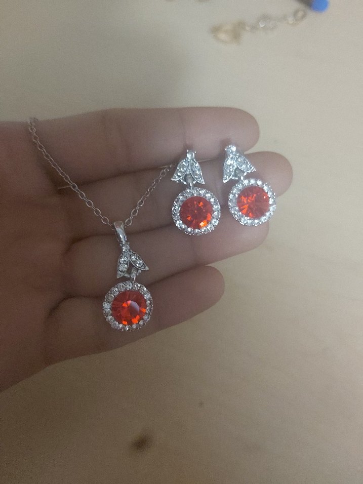 Kırmızı taşlı, parlak detaylarla süslenmiş kadın takı seti. Kolye ve küpeler, klasik şıklığa uygun canlı renklerle tasarlanmıştır.