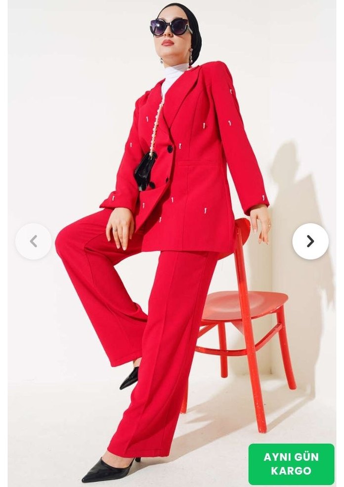 Kırmızı Taşlı Kadın Uzun Ceketli Takım