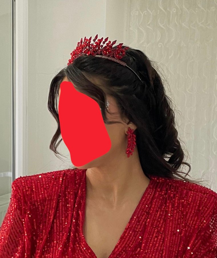 Koyu kırmızı renkte, el işlemeli saç aksesuarı, göz alıcı ve avangart bir görünüm sunar. ✨ Kına tacı