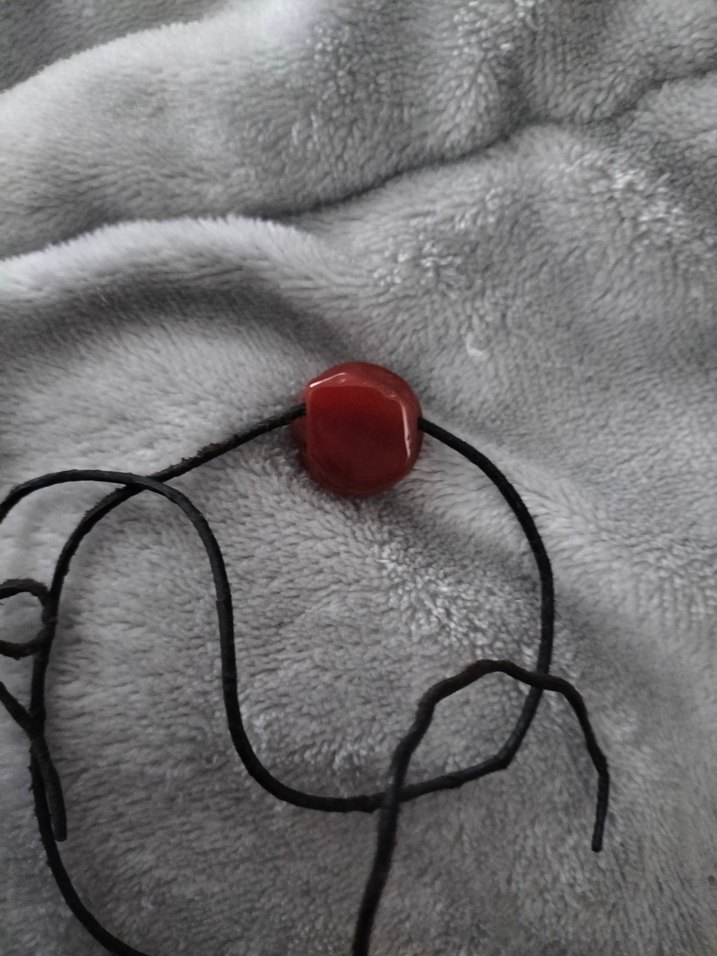 Siyah ip üzerinde tek kırmızı taş bulunan minimalist ve bohem tarzda kolyesi. Gotik ve retro stillere uyum sağlar.