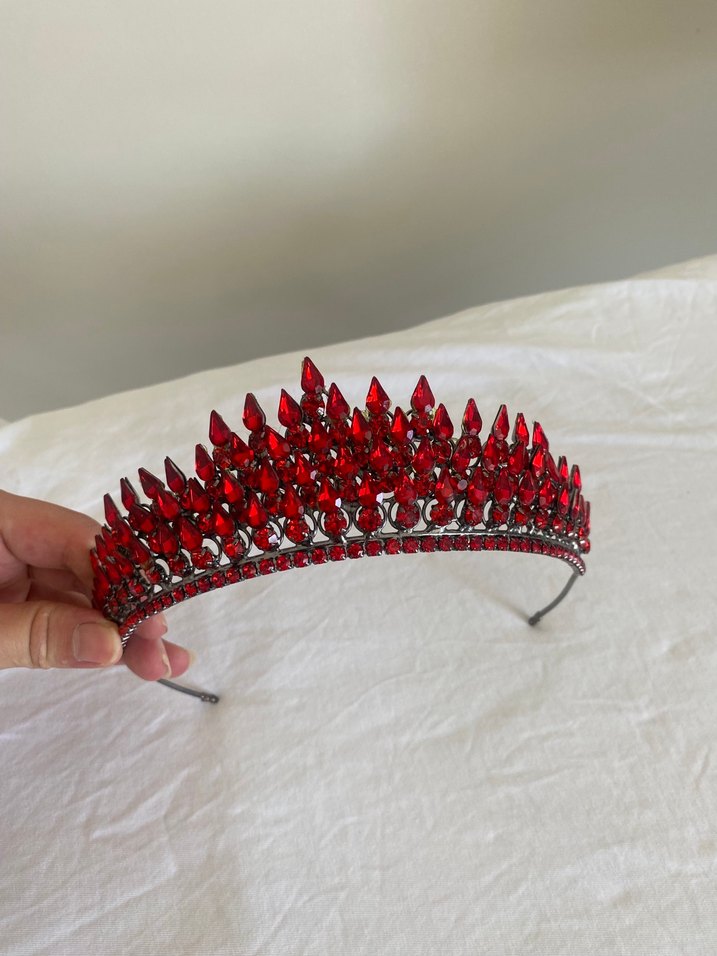 Kırmızı taşlarla süslenmiş plastik taç, parlak ve gösterişli bir görünüm için ideal. Bohem ve retro tarzlara uygun. Kınamda kullandım hiç bir defosu yok